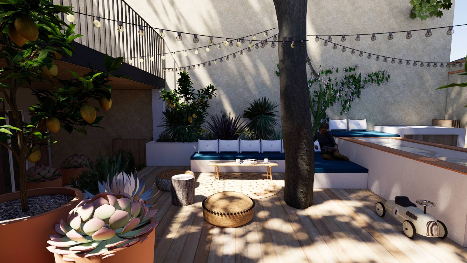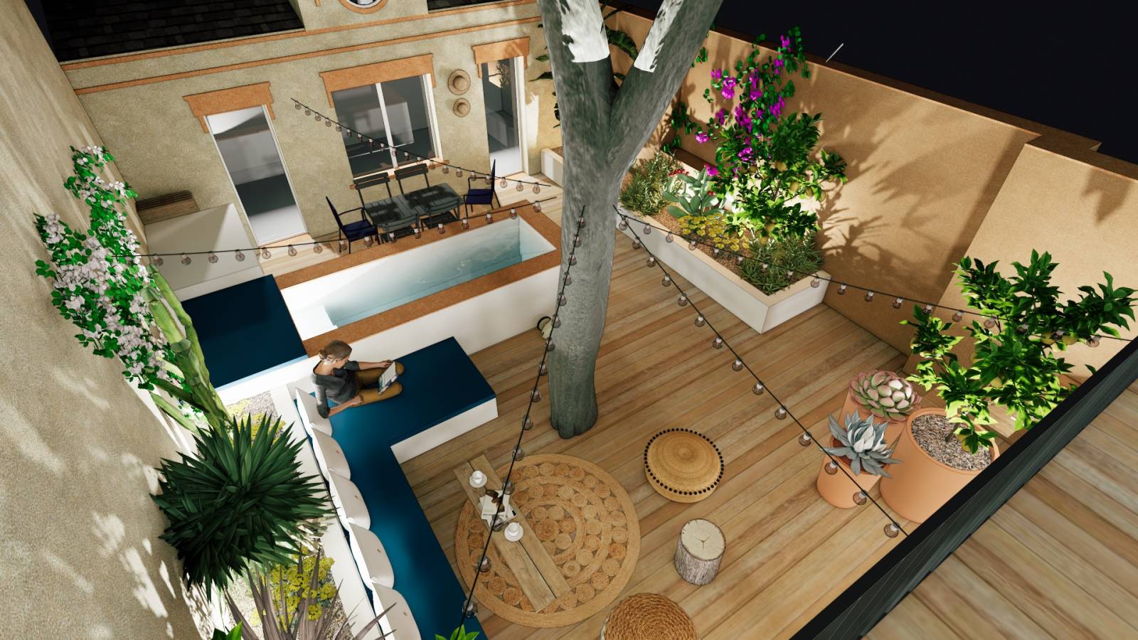 Les propriétaires nous contact pour créer un espace extérieur chaleureux, conçu pour la vie de famille, tout en préservant le magnifique platane qui trône au cœur du jardin-patio.