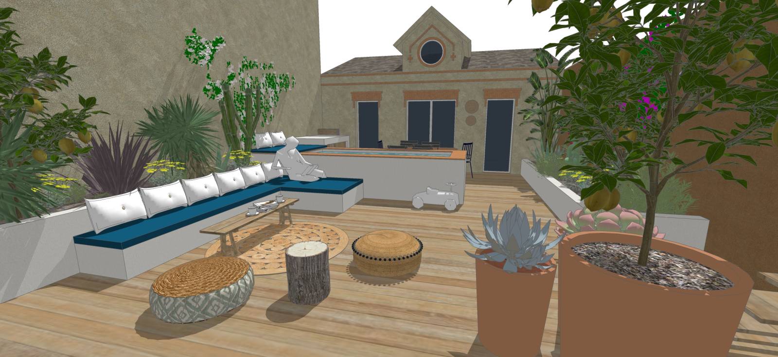 Le projet dévoile des espaces soigneusement conçus, du coin repas avec du mobilier Fermob pour des déjeuners en famille aux banquettes maçonnées sur-mesure, créant un espace de détente polyvalent entre transats et salon de jardin. L'espace près de la piscine est aménagé avec une grande banquette, invitant à l'installation de coussins et de futons d'extérieur.