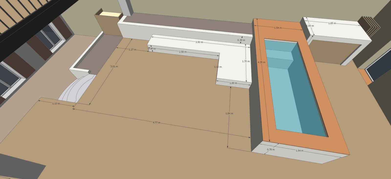 Les margelles de la piscine, en terre cuite, évoquent la façade de l'atelier en cours de rénovation, un clin d'œil à cette maison de village.