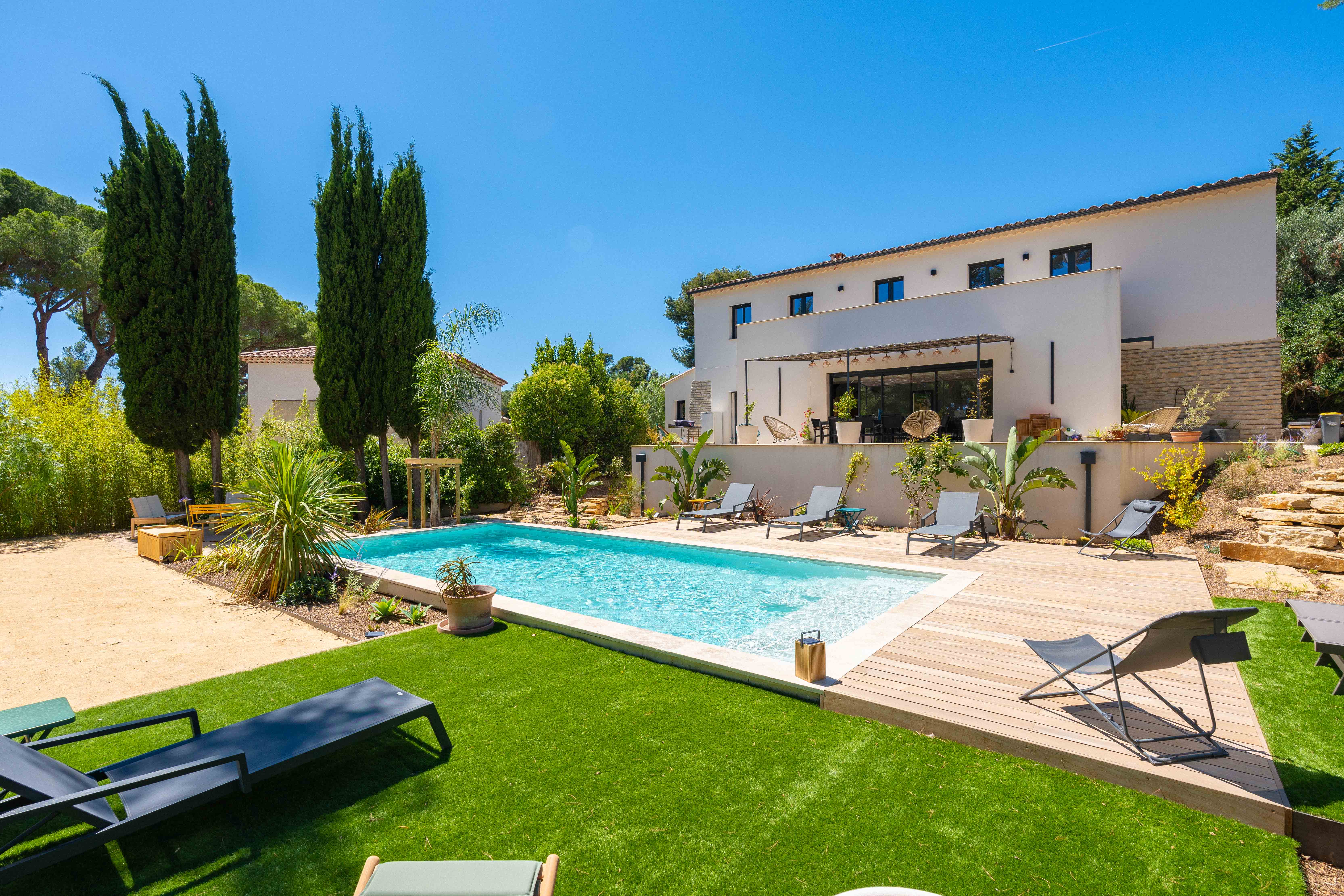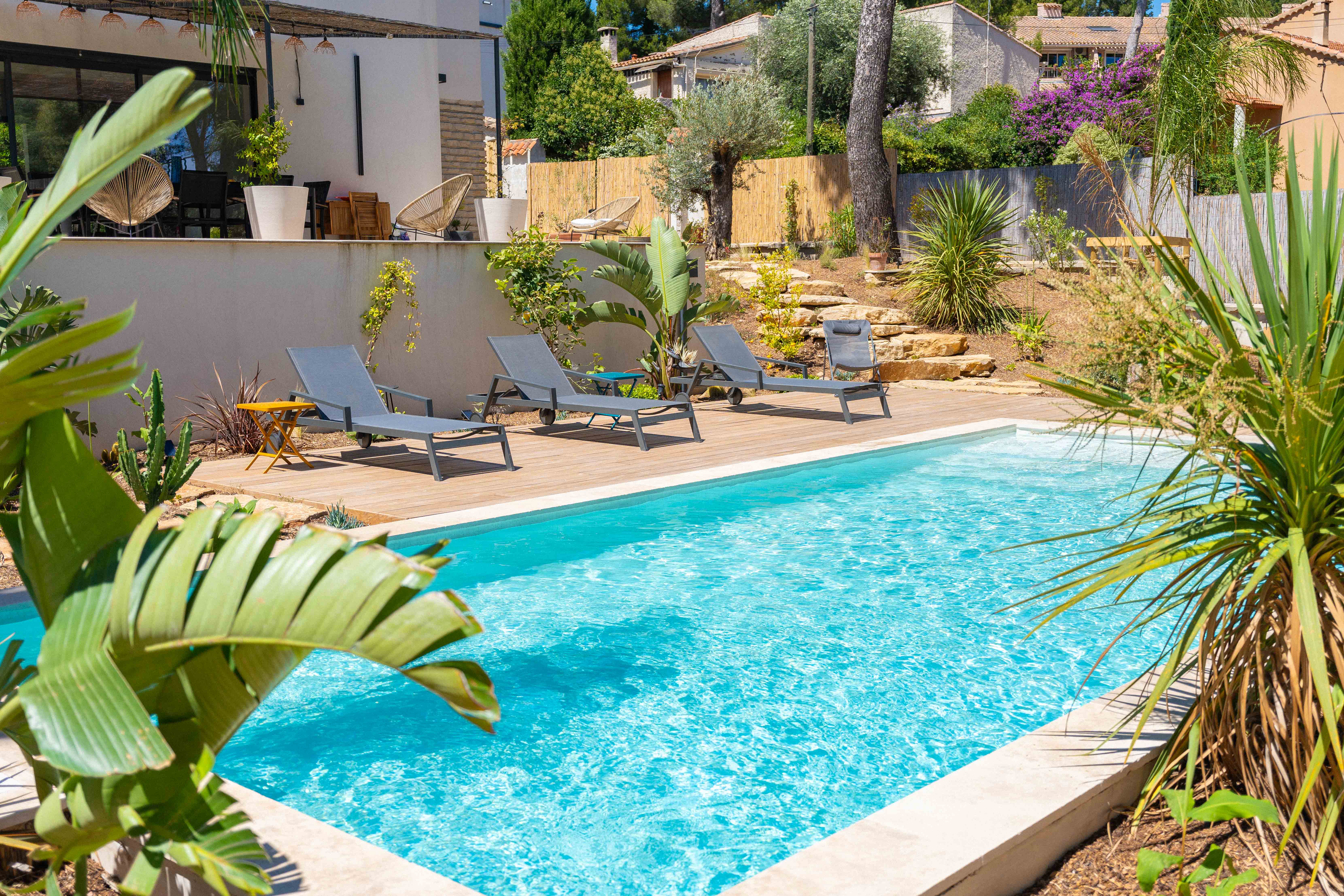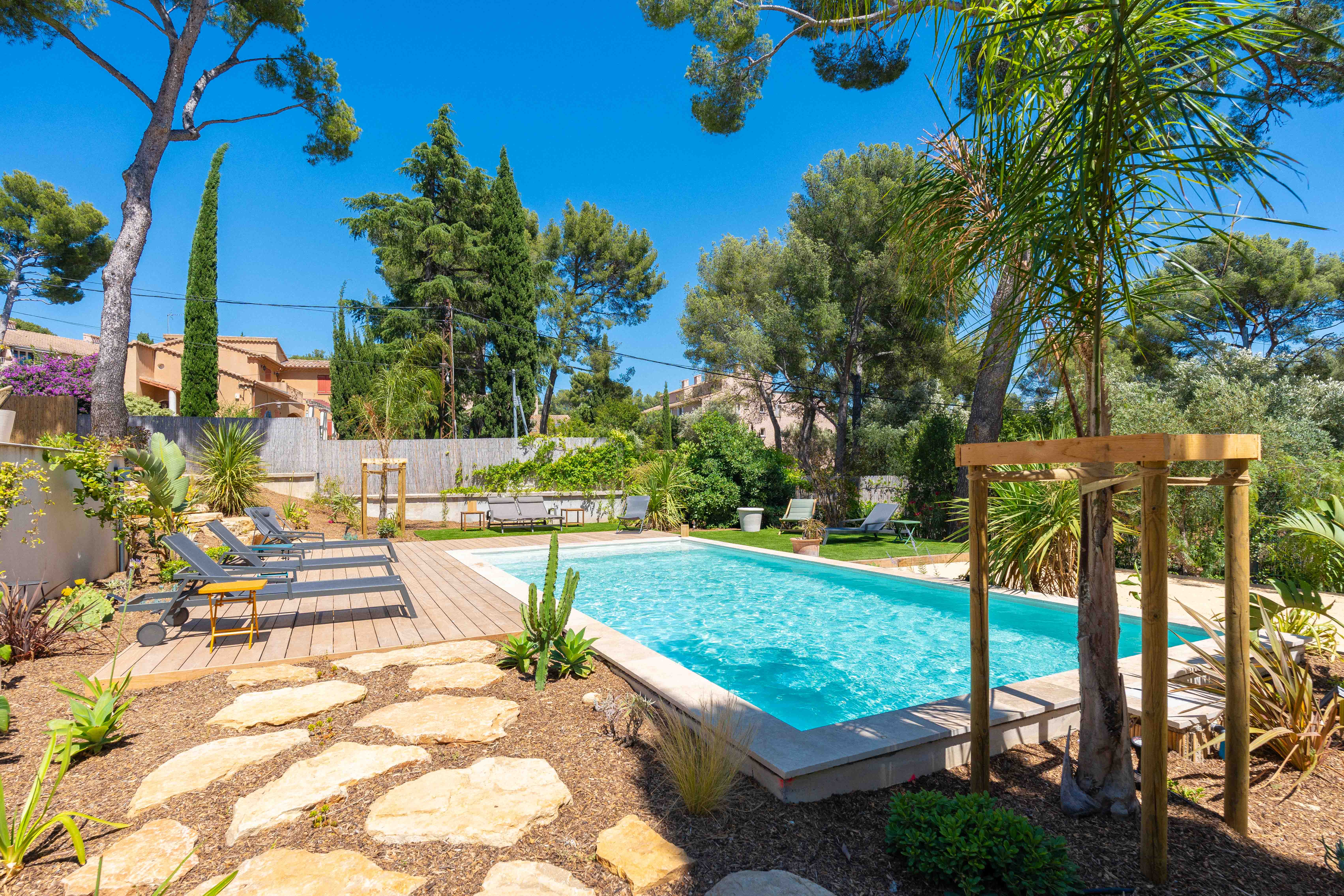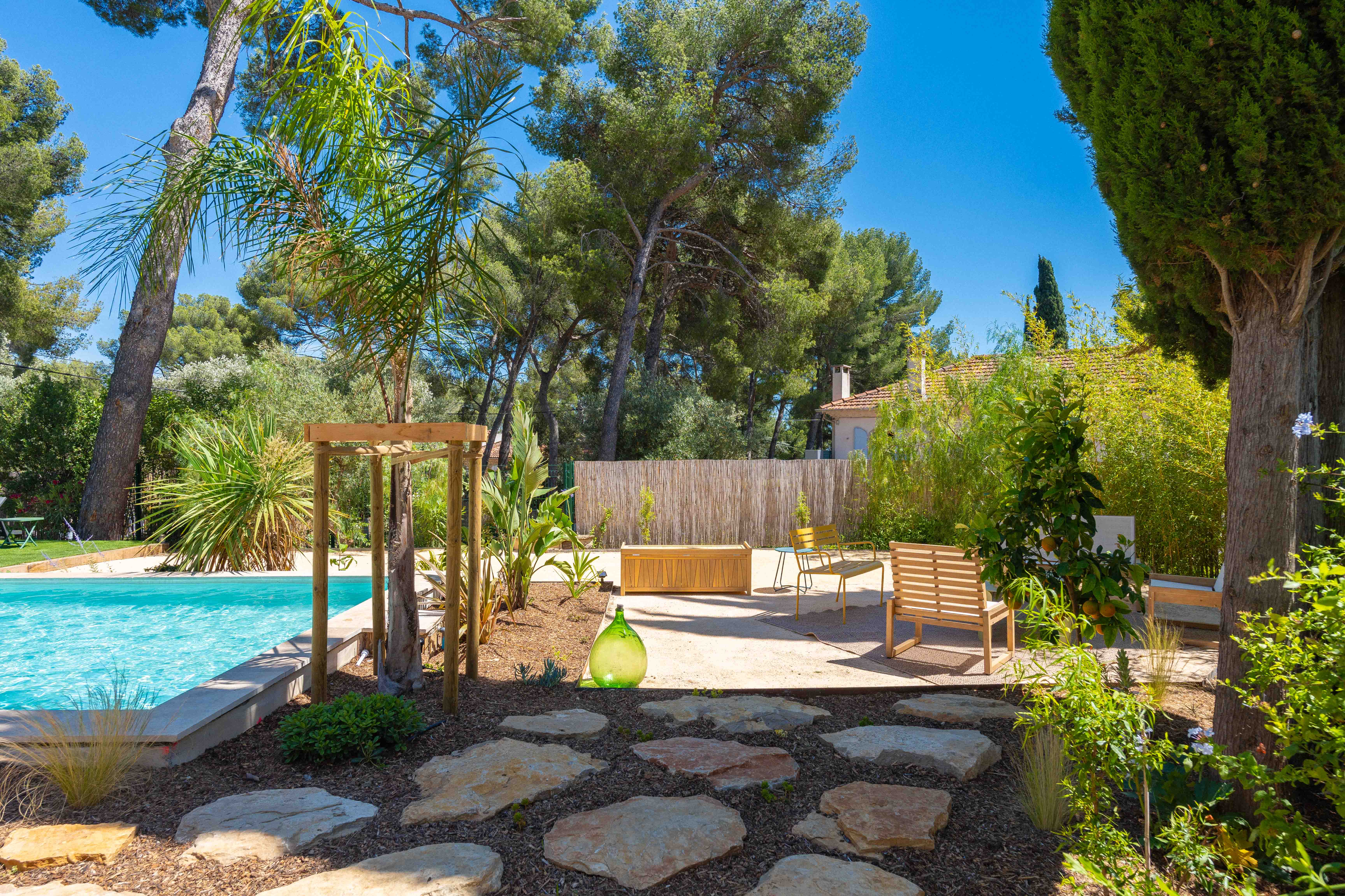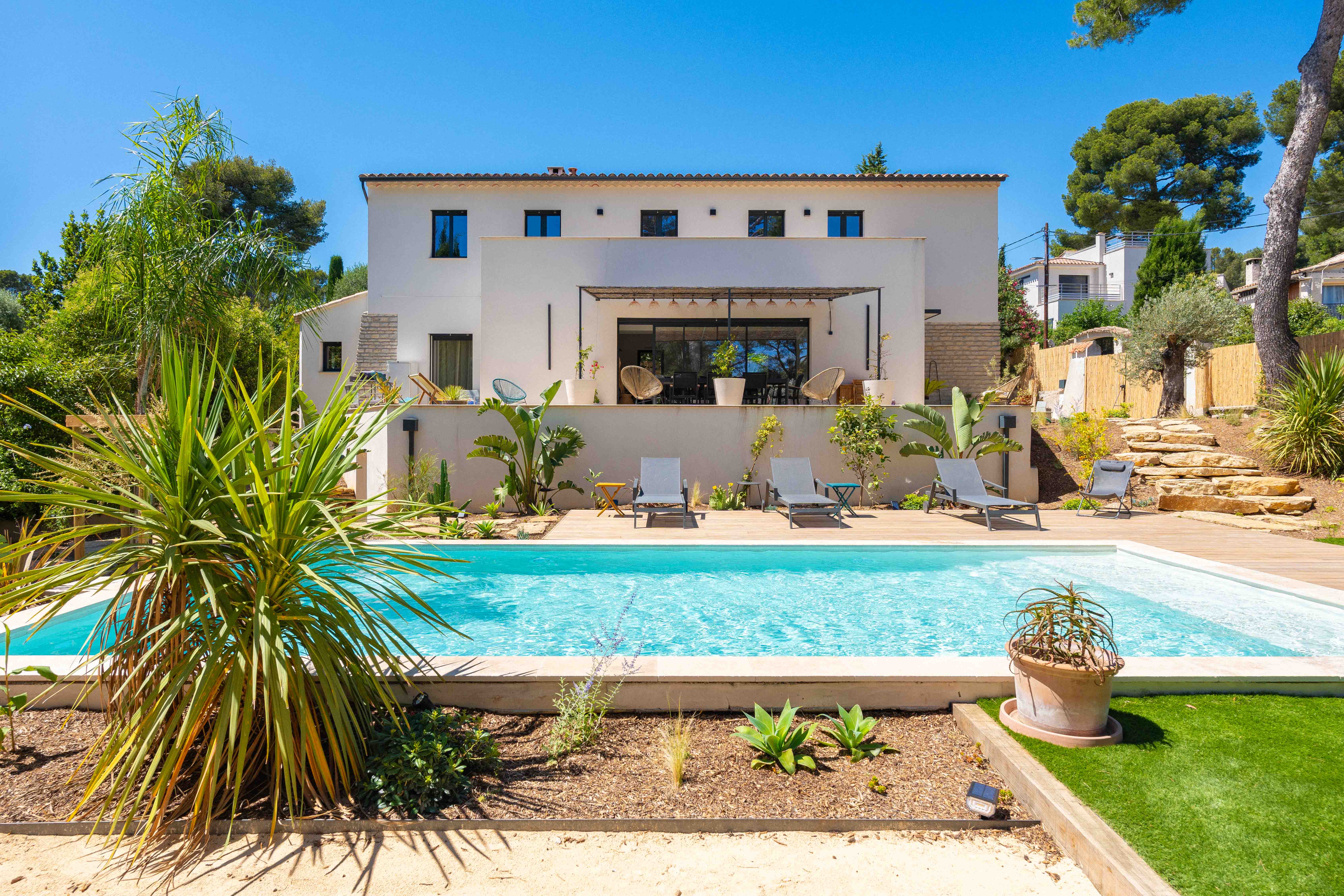 Le projet à Aix-en-Provence avait pour but de concevoir un jardin harmonieux et fonctionnel autour de la piscine maçonnée, en parfaite symbiose avec l'environnement naturel. Le principal défi était de maximiser la topographie du terrain en pente pour créer des espaces de vie distincts tout en intégrant les éléments naturels existants. Notre objectif était de transformer ce terrain vierge en un espace accueillant, multifonctionnel et durable, où chaque détail a été minutieusement pensé pour maximiser le confort et le plaisir des propriétaires de cette villa familiale.