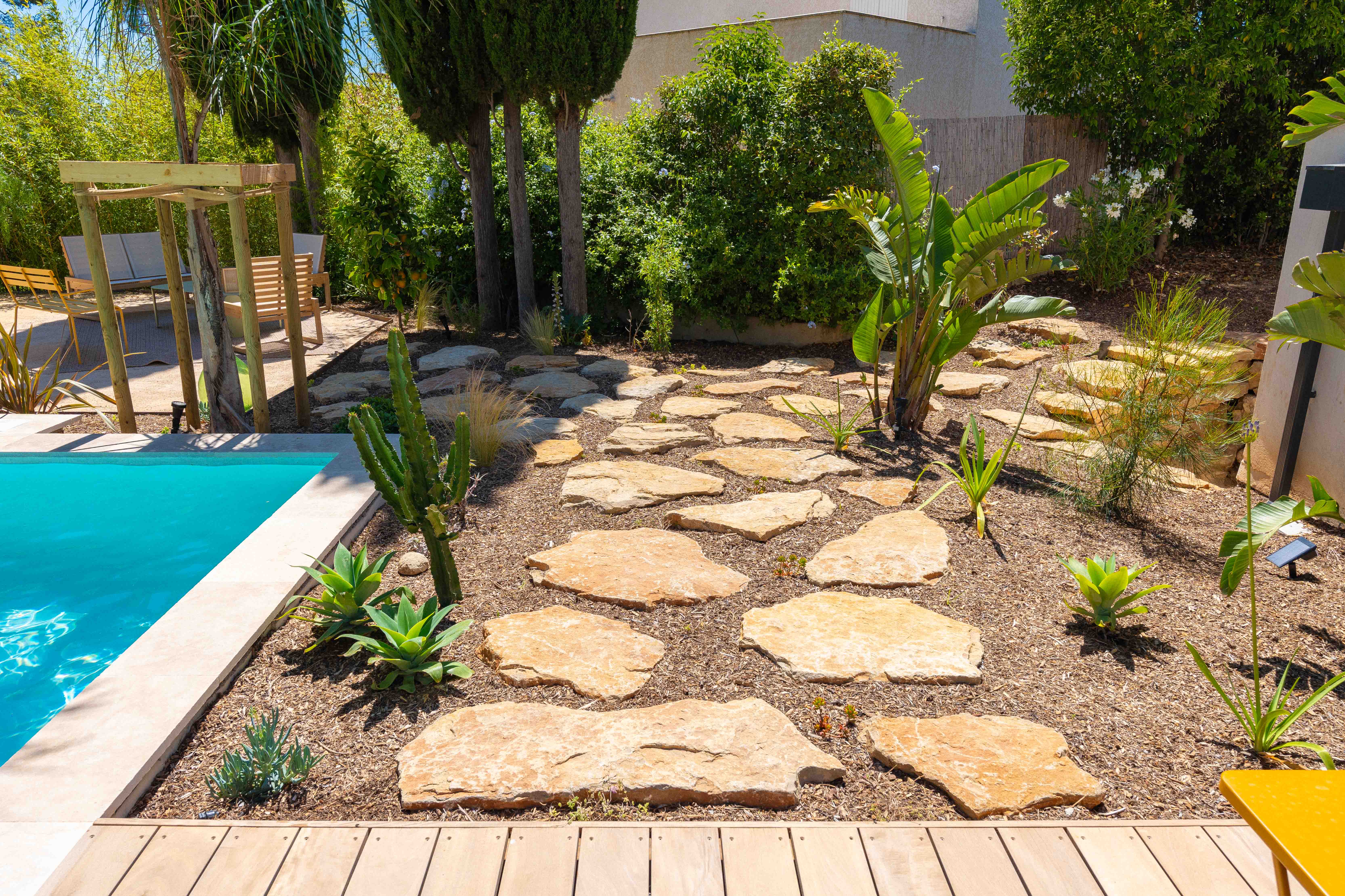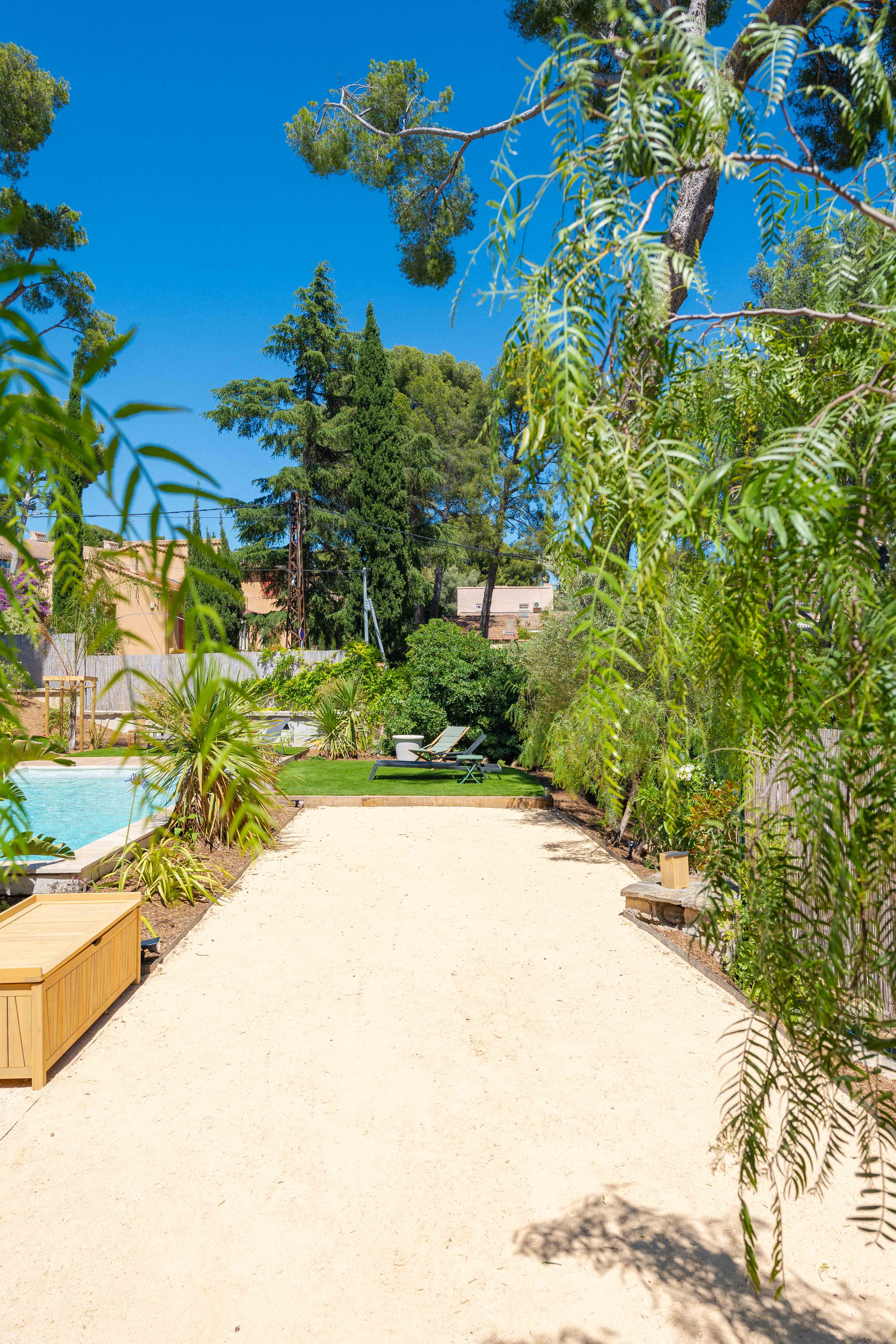 - Aménagement de différents espaces : salon de jardin, terrain de pétanque, solarium, terrasse en bois, espace gazon et zones plantées.