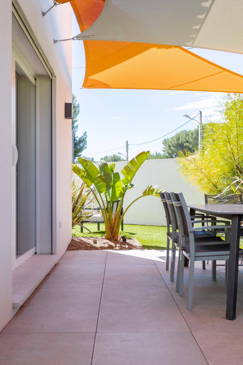 terrasse en dalles 60 x 60 cm en grès cérame antidérapante a été créée au sud de la maison. Très exposée aux vis-à-vis des maisons voisines et au soleil, notre solution de