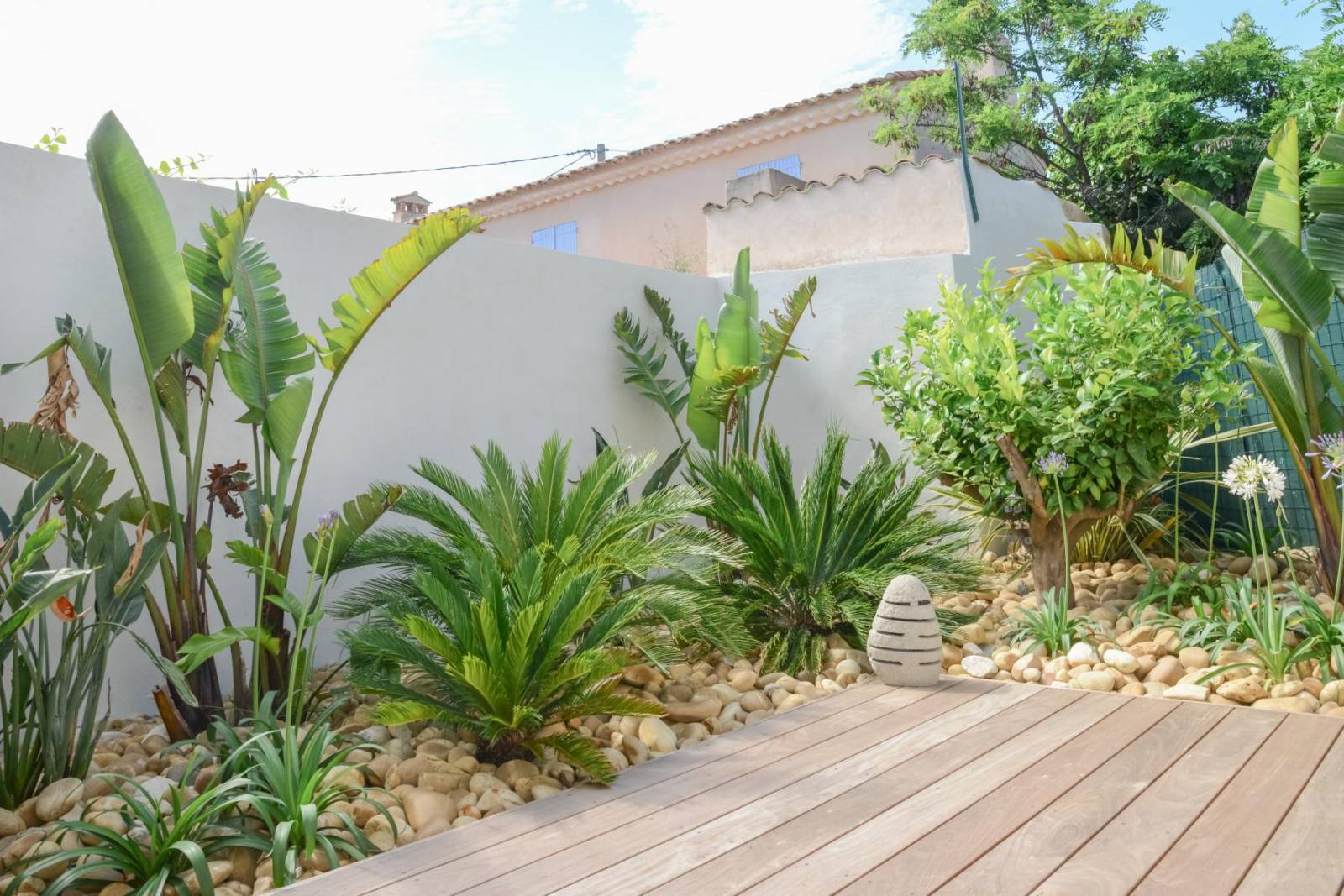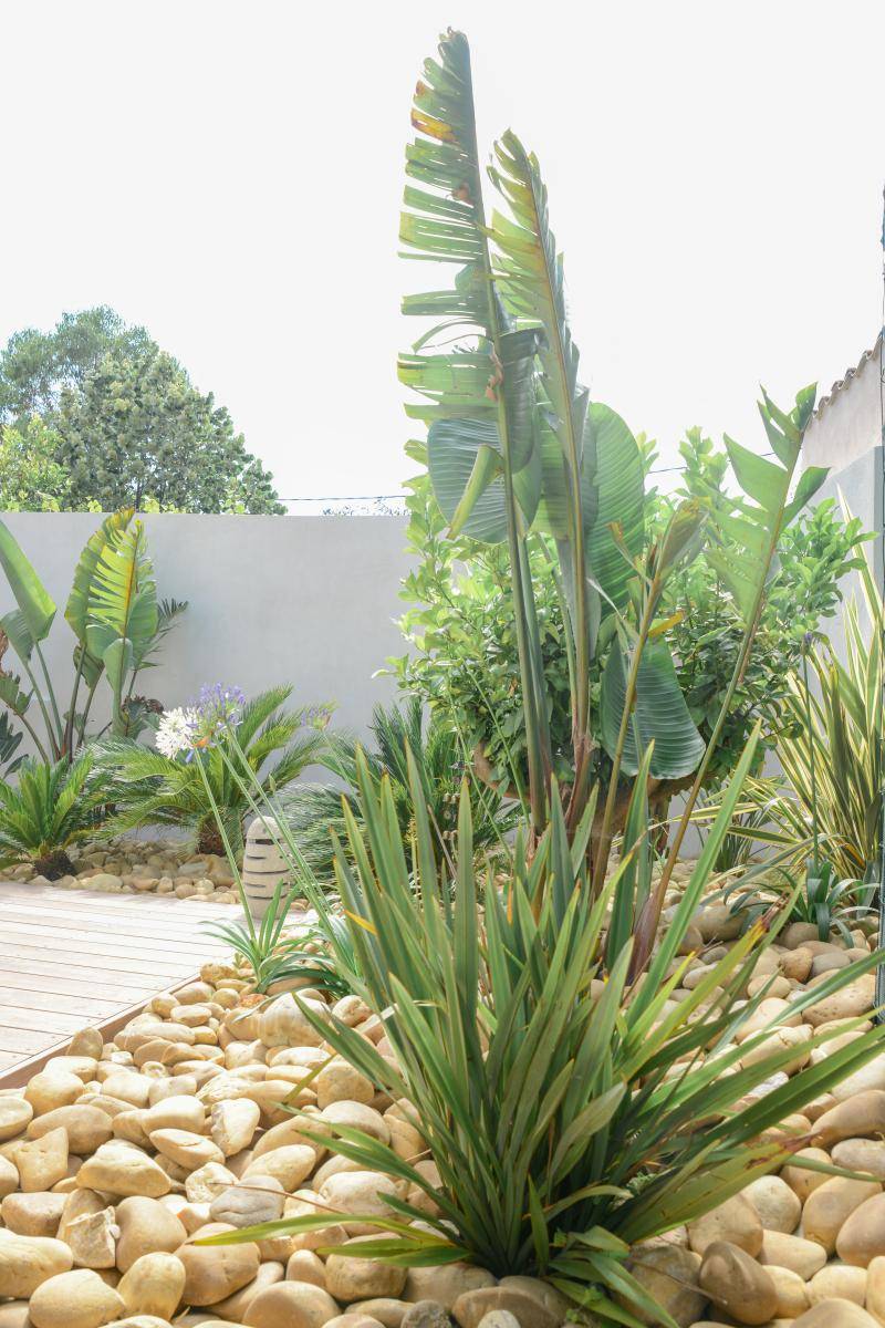 Les massifs exotiques plantés (de Strelitzia augusta, Phyllostachys bissettii, Cordyline elephantipes...), les dalles de schistes, et les revêtements de sol gravillonnée en galets (gris de la durance) nous plonge dans une ambiance de maison de vacances.
