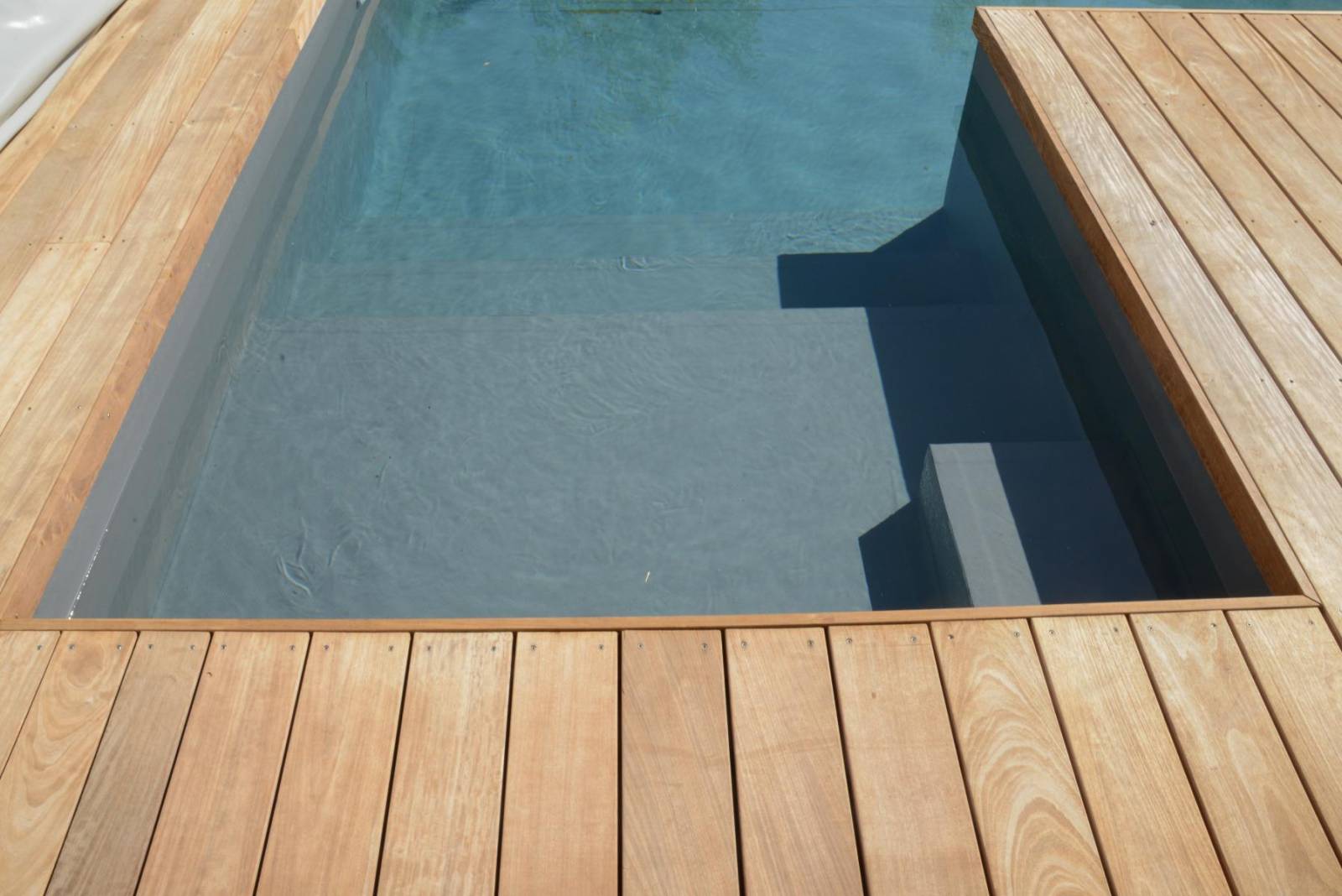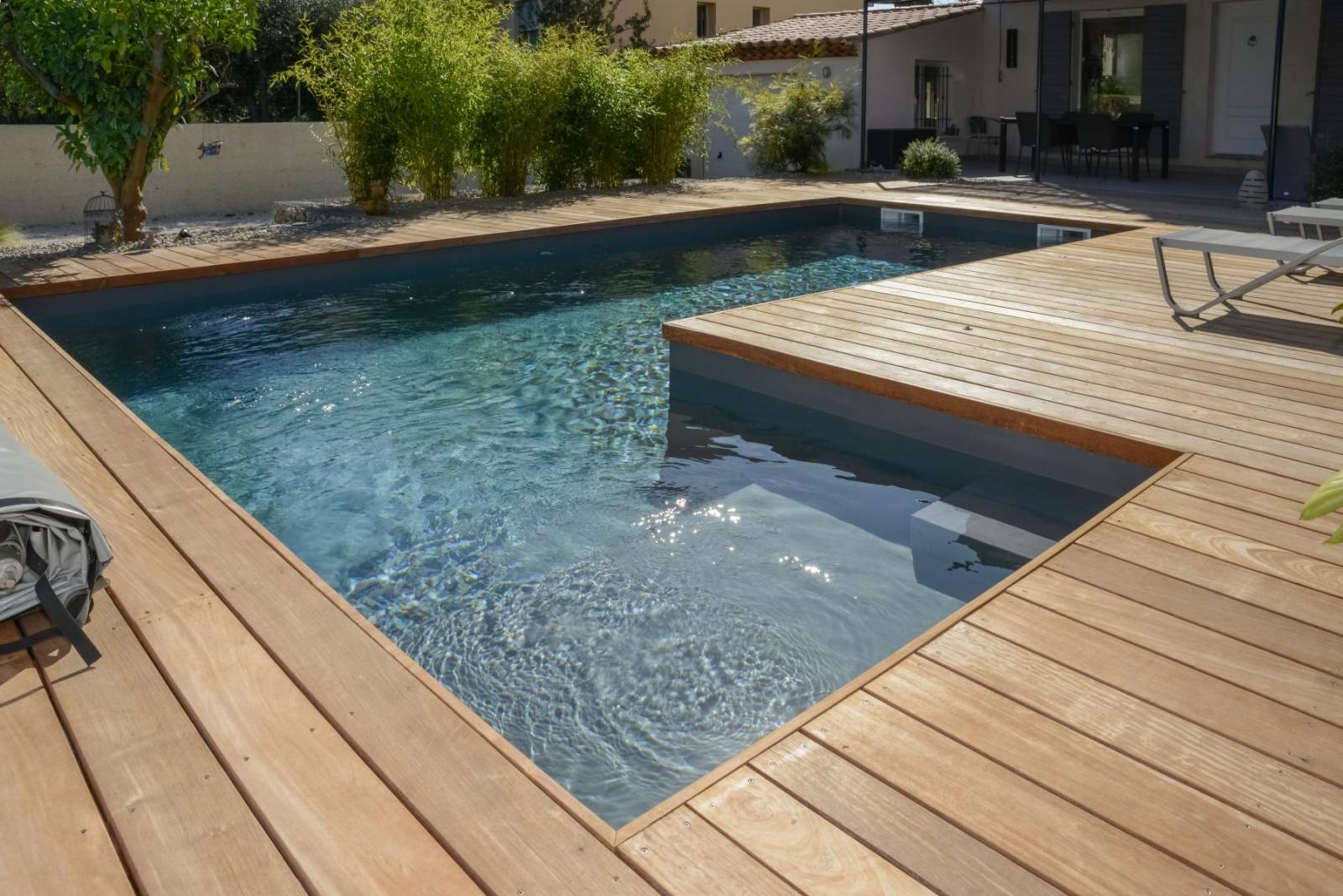 Nous avons créé un environnement convivial, pour que les enfants s'amusent en toute simplicité autour et dans la piscine. Une grande terrasse en bois peut recevoir des chaises longues et la piscine a été réalisé avec une banquette immergée permettant de discuter les pieds dans l’eau.