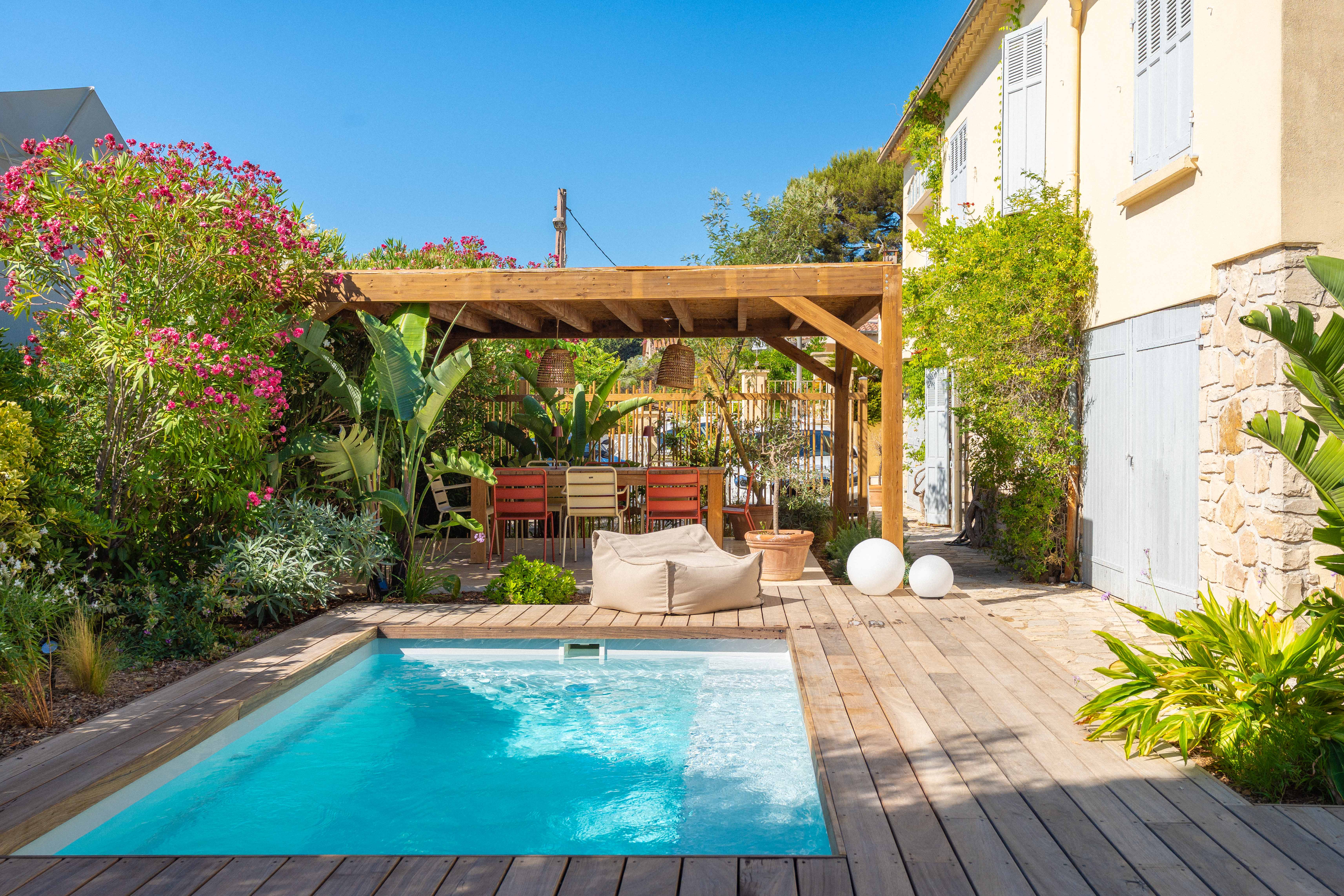 La mini piscine, compacte mais confortable, utilise une filtration au sel pour garantir un entretien facile et une eau cristalline tout au long de la saison. La terrasse en IPE relie harmonieusement la maison aux espaces de vie extérieurs, offrant un espace idéal pour la détente et les repas en plein air.