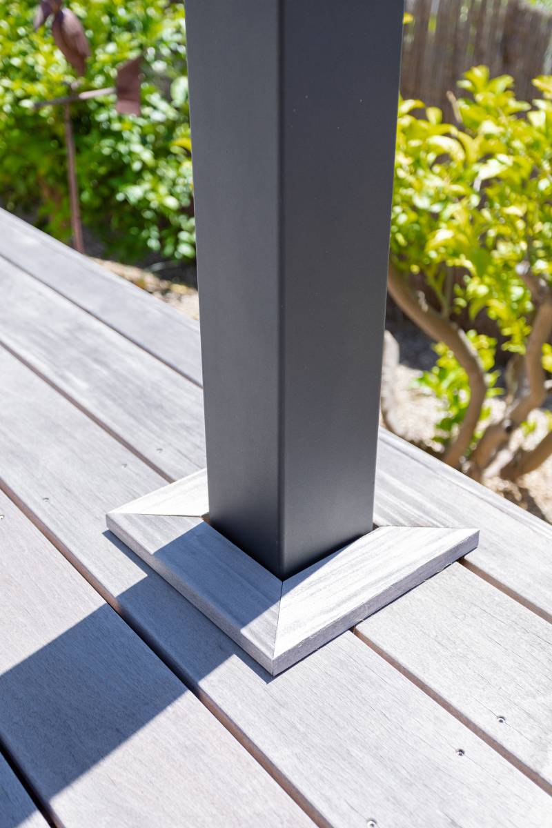 Au cœur du projet, une terrasse en bois exotique FSC (essence : Garapa) qui surplombe l’espace paysager. Ce choix, à la fois économique et esthétique, garantit une belle patine dans le temps, une excellente tenue à l’humidité, et une ambiance chaleureuse au quotidien. Une pergola en bois, pensée sur-mesure, vient créer une zone d’ombre agréable au-dessus du coin repas.