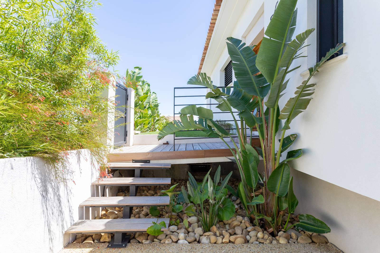 De jardinières, bancs, escaliers, pare-vues bois sur mesure, coordonnés à l’ensemble.